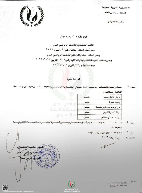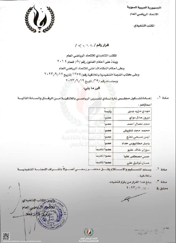 أصدر المكتب التنفيذي للاتحاد الرياضي العام، اليوم الأربعاء، قراراً بإعادة تشكيل مجلس إدارة نادي تشرين.