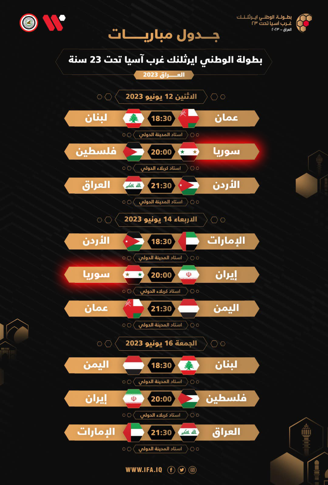 ووفق الجدول المعلن، فإن اليوم الأول من بطولة غرب آسيا سيشهد إجراء 3 مباريات، الأولى تجمع عمان ولبنان بملعب المدينة الدولي بالعاصمة بغداد، والمباراة الثانية بين سوريا وفلسطين بملعب كربلاء الدولي،