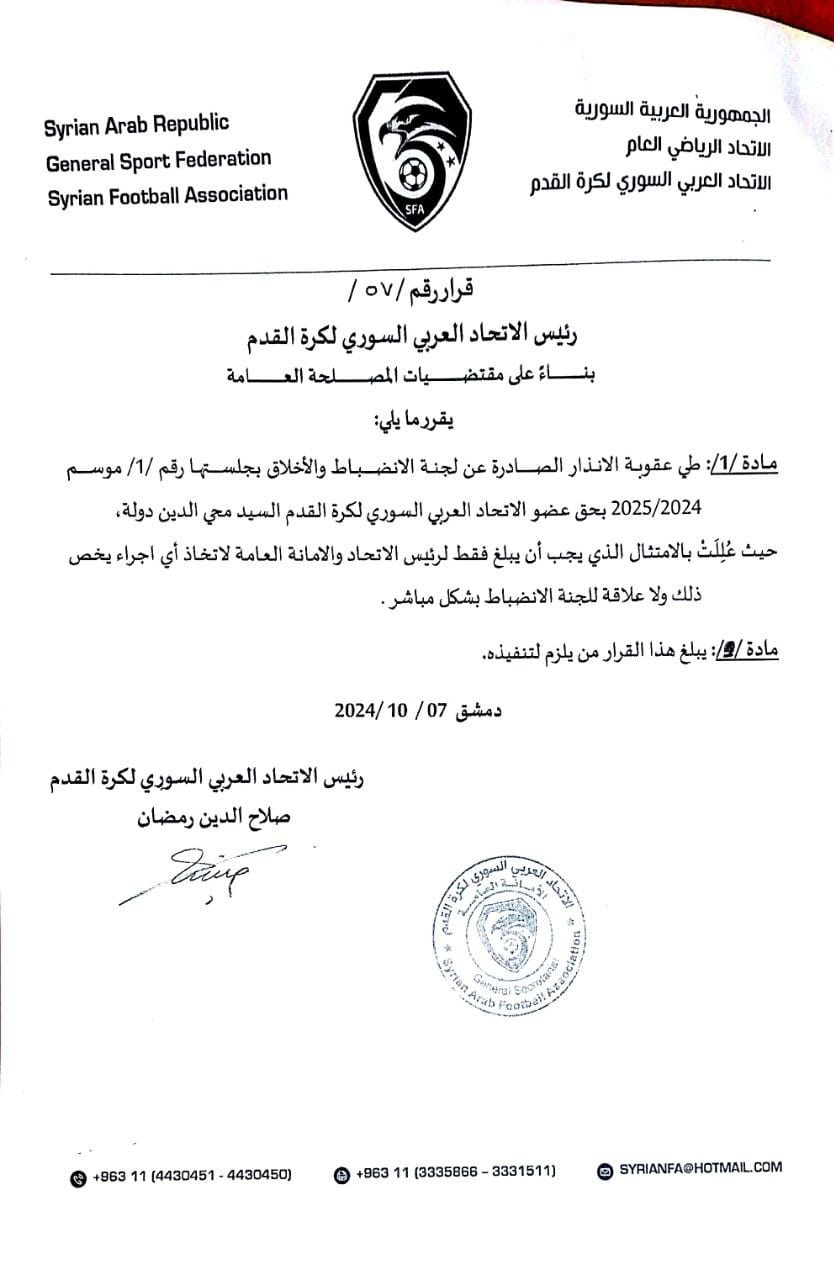 من جهته السيد محي الدين دولة لـ “أثر سبورت” أنه ضمن النظام الأساسي للاتحاد لا يحق للجنة الأخلاق والانضباط معاقبة أي عضو باللجنة التنفيذية للاتحاد السوري لكرة القدم.