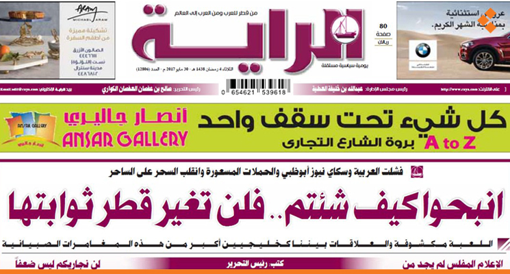 صدر العدد اليومي الجديد لصحيفة “الراية” القطرية، ويتصدرها عنوان بالخط العريض “انبحو كيف شئتم.. فلن تغير قطر ثوابتها”، وليذيّل العنوان بعدد من وسائل الإعلام السعودية والخليجية، في إشارة إلى الحرب الإعلامية التي تشغل الرأي العام الخليجي.