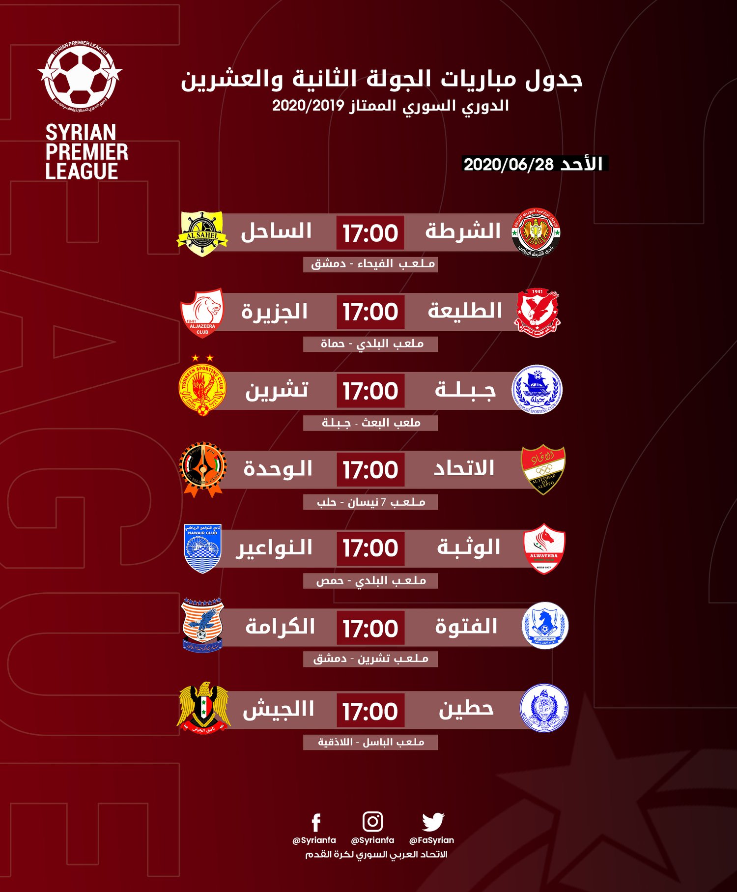 جدول مباريات الجولة 22 من الدوري السوري الممتاز: