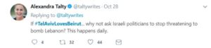 سبحة التعليقات كرّت مرفقة بالهاشتاغ المذكور، وغرّد “الإسرائيليون” بطريقة استفزازية لإظهار أنفسهم أمام العالم بصورة الكيان المُسالم، وراحوا يسلطون الضوء على التشابه بين المدينتين جغرافياً، ومشاركتهم نفس المأكولات مع بيروت والعادات.