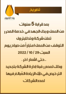 وأفادت الشركة في بيانها بأن توقفها جاء بسبب عدم قبول شروط الترخيص التي فرضتها عليها “هيئه تحرير الشام” بالإضافه لترخيص 6 شركات لتوريد النفط وهي شركه “السلام وشركه الرحمه والاتحاد والعالميه والعربية”.